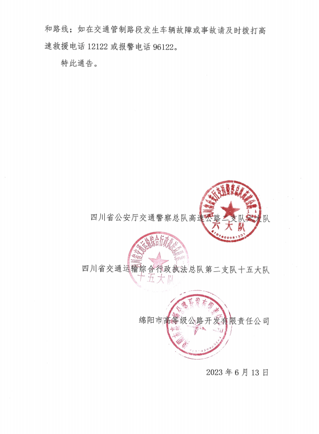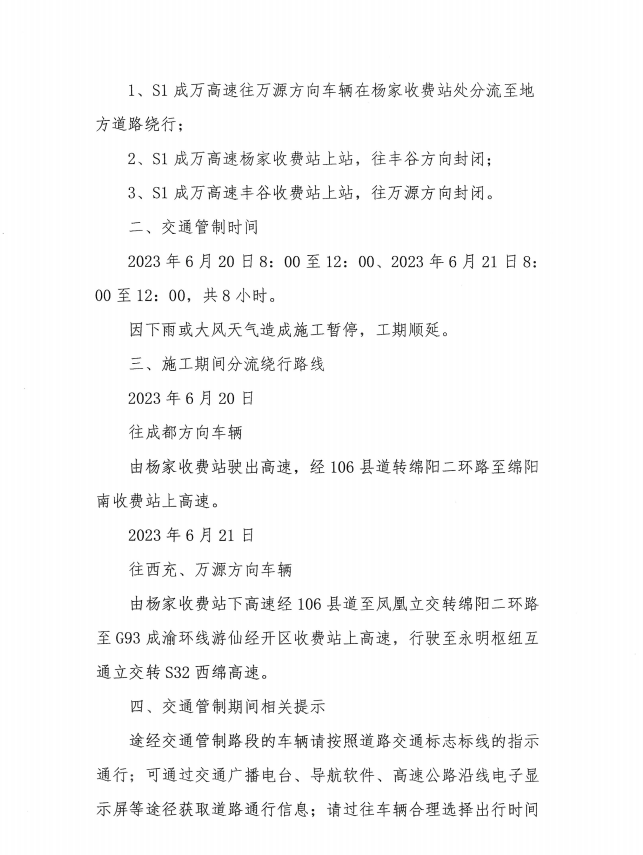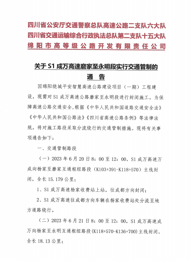 關(guān)于S1成萬(wàn)高速磨家至永明段實(shí)行交通管制的通告