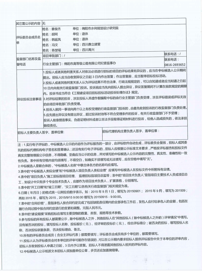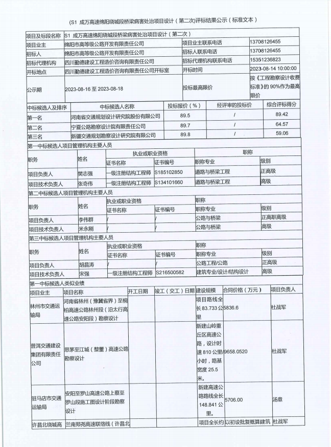 (S1 成萬高速綿陽繞城段橋梁病害處治項目設(shè)計(第二次)評標結(jié)果公示(標準文本)