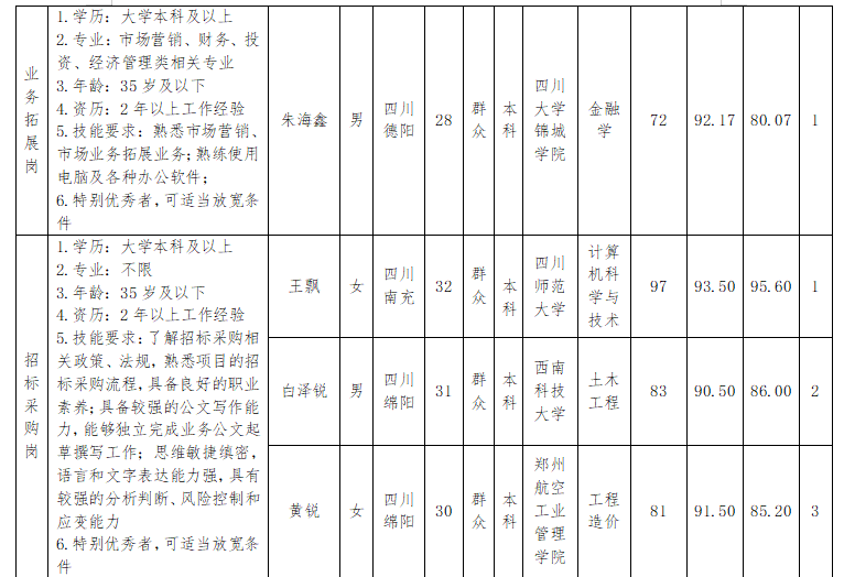 根據(jù)高開司發(fā)布的招聘公告及招聘相關(guān)規(guī)定,經(jīng)筆試、面試等程序,現(xiàn)將成績予以公示。
